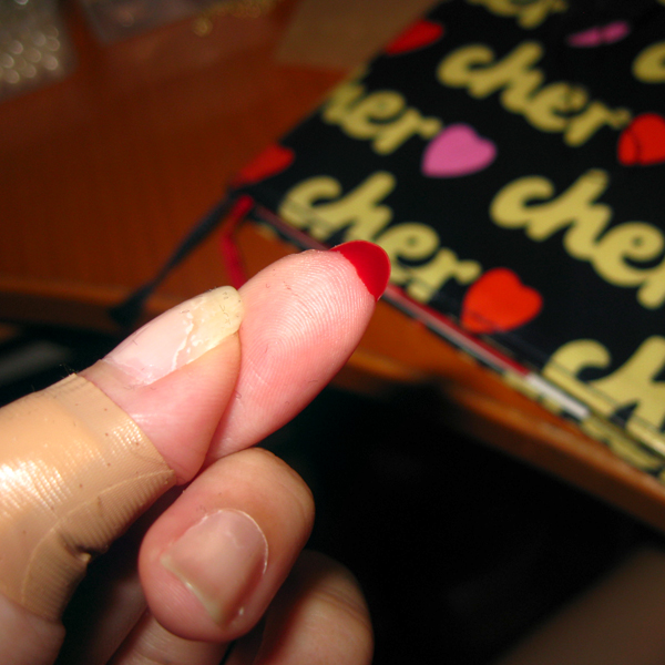 first i cut my thumb, i don’t know how but i did… i’m guessing it was a slip of the pliers… and then, i pricked the very tip of my finger… see that red pool collecting in my nail bed? yea that’s blood. not nail polish. ben’s just gonna gimme the face when he sees this.. lol he’s given up on me cos i’m so accident prone…