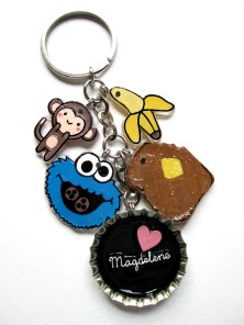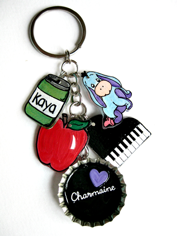 a set of customised keyrings for Magdelene and her BFF, Charmaine… all charms are hand drawn.