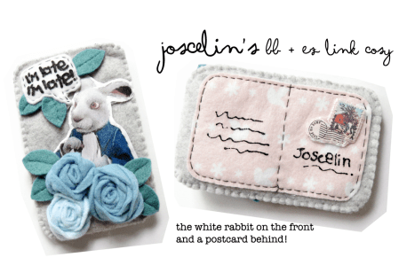 Joscelin’s BB cosy, it’s got the white rabbit design on one side and a postcard design on the back. but that’s not all, it actually is able to hold cards in the postcard too! hope this is what you wanted babe! :)