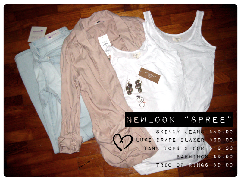 While i was waiting for Mimi to try out her stuff i went roaming around the store and found this really pretty dusty pink/nude blazer. last piece in size 8, thank goodness it fits so i scored that too! along with 2 basic white tanks to go with my new skinnies. while waiting to pay i picked up a pair of dangly earrings and a bunch of rings.