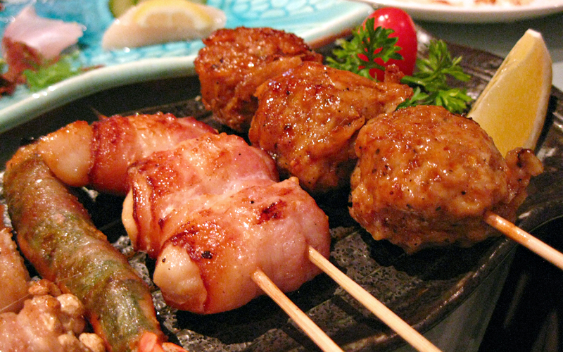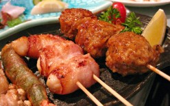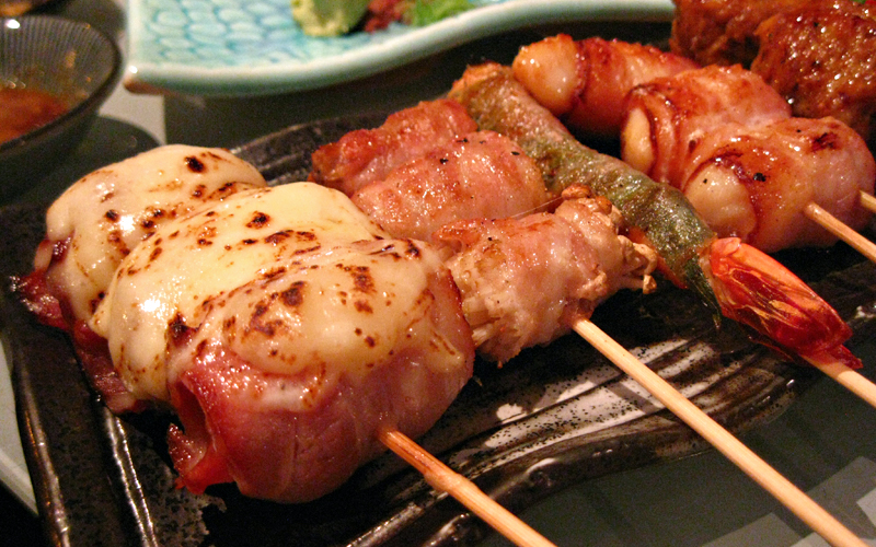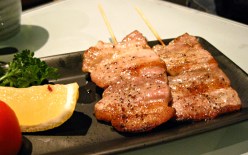 we ordered a plate of yakitori which consisted of 5 variations… tomato bacon cheese, chicken balls, enoki maki, ebi, and i can’t remember what the last one was called. who’d have thought cherry tomatoes go so well wrapped with bacon & cheese? (but then again you can’t really go wrong with anything that’s got bacon & cheese in it, can you?)