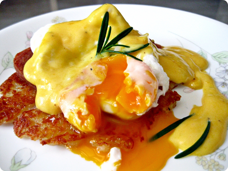 rosti with gruyere cheese, bacon, poached egg & hollandaise sauce…