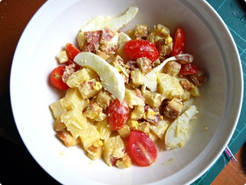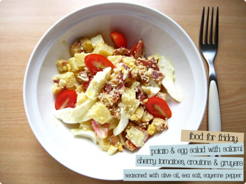i saw ed’s sister’s mango, avocado & prawn salad post last night and was craving for a “salad fix” today. don’t have avocado at home & i didn’t want to dig through the freezer for prawns so i settled for a potato, egg and salami alternative instead. (yes jones, i’m enjoying your salami, ALOT!)