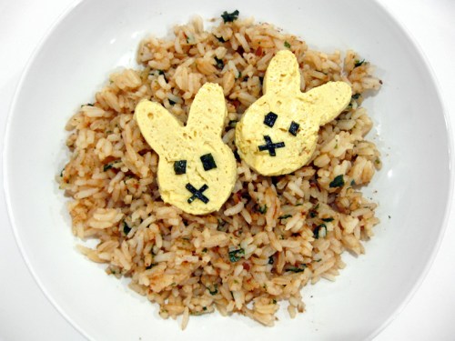 i was trying to cook tamagoyaki for the first time ever and failed, not miserably tho since i managed to salvage the egg and turn them into cute egg bunnies. i did manage to shape it into a “block” but the layers just weren’t there. i must have added too much stock cos the consistency turned out to be more like the steamed egg my mum usually makes.