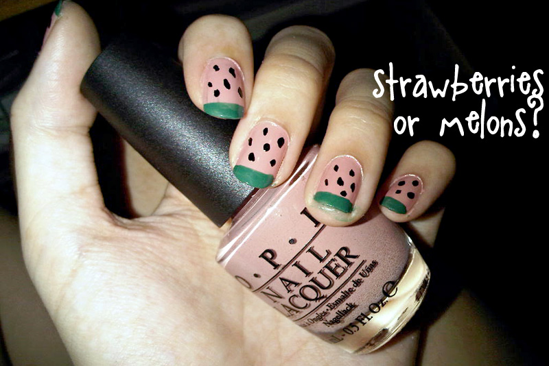 …i can’t quite decide if they’re strawberries or watermelons.. but then again, who cares right? lol. i’m not usually a nail art person… i do french manis myself too but these days, if i have time to repaint my nails every week it’s already an achievement. i just got really bored that day…