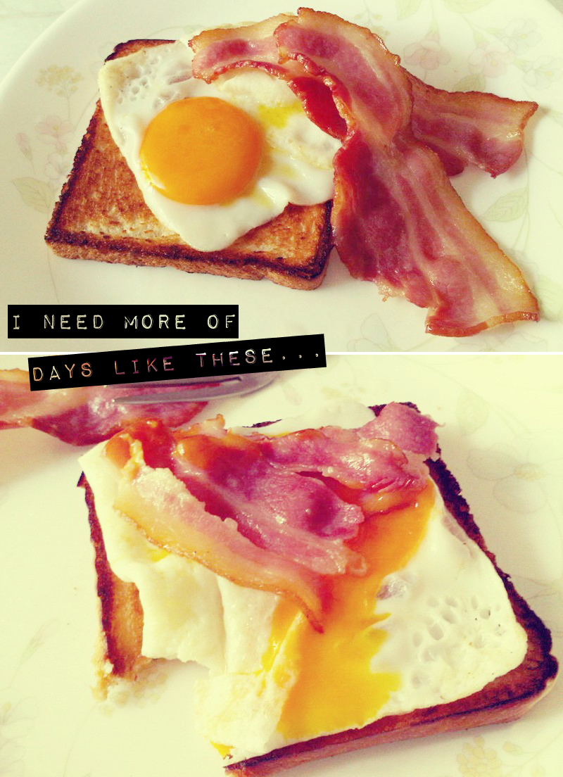 This was actually better than scrambled eggs, must be the half-cooked yoke. I had the bacon cooking in the toaster so I “toasted” the bread in a frying pan instead. You save on the oil mess from frying bacon in a pan, and bread actually tastes really good if you fry it with butter instead of just toasting it.