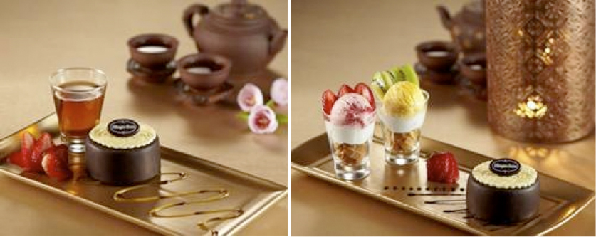 Autumn Celebration (right) is a trio of decadence! The ice cream mooncake is accompanied by petite servings of strawberry ice cream, mango and passion fruit ice cream, both served in miniature glasses with crunchy waffle chips, whipped cream and refreshing slices of strawberry and kiwi. Autumn Celebration is priced at S$29++.