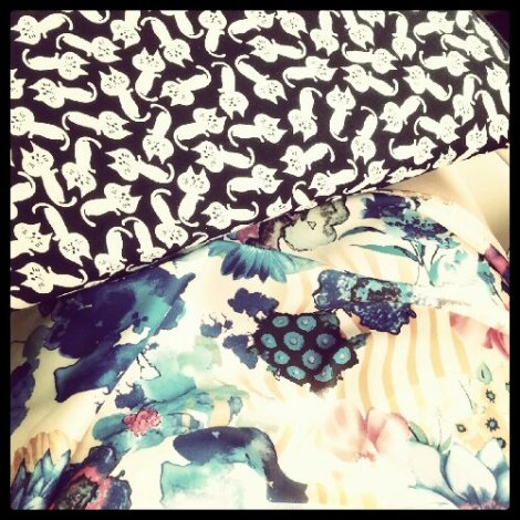 Cat print laptop case used as clutch & watercolor floral dress by To Love Kuvaa. Both from ASOS.