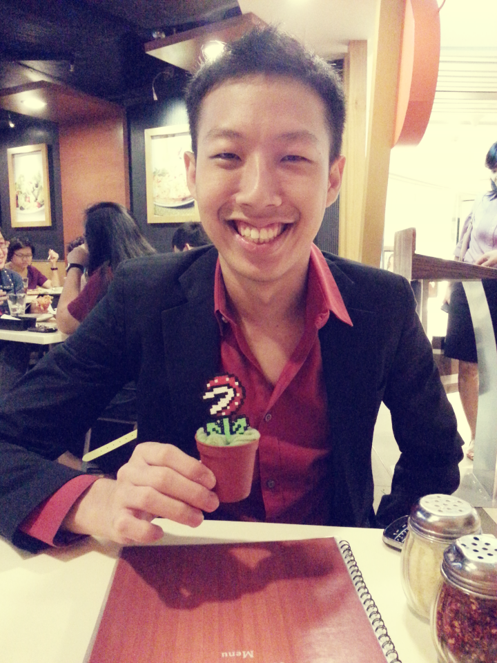 Alvin and his EXTREMELY belated birthday gift, the Mario piranha plant, which is now his favourite and uhmmm perhaps only, pet plant. Handmade by yours truly. :D