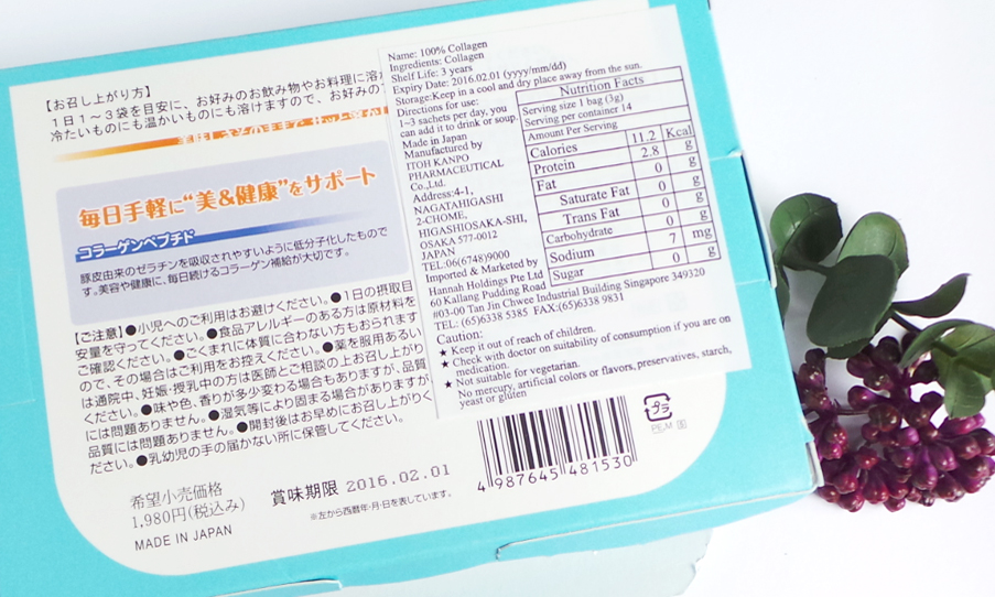 The fact that it is extracted from pig’s skin may have some of you questioning if this might smell “porky”, but it does not. I personally prefer dissolving a sachet either in my tea or in a bowl of soup. If you do drink this with tea, it will make your tea turn murky like a milk tea. If that bothers you (consciously knowing something else is in your tea) then I would suggest adding it to a cream soup or juice and you won’t even remember adding something to it.
