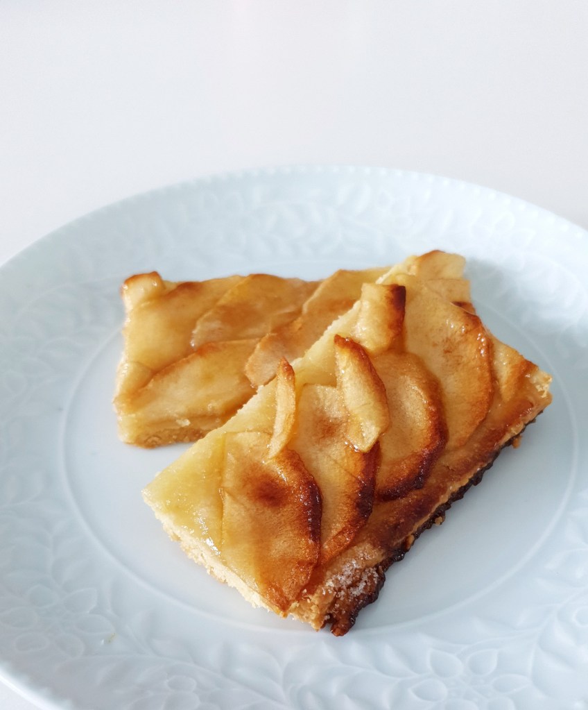 I made this apple tart last week and it was so good we finished it in 2 days! I just had to share it with you. The original recipe is adapted from The Food Network, you can check it out too! The only difference is that I made the crust by hand instead of in a mixer and did not use Calvados to glaze the apples after. I sliced my apples pretty thin this time, you might want to cut them thicker if you want to have more bite to it, if you slice them too thin they tend to get a bit “leathery” after baking.